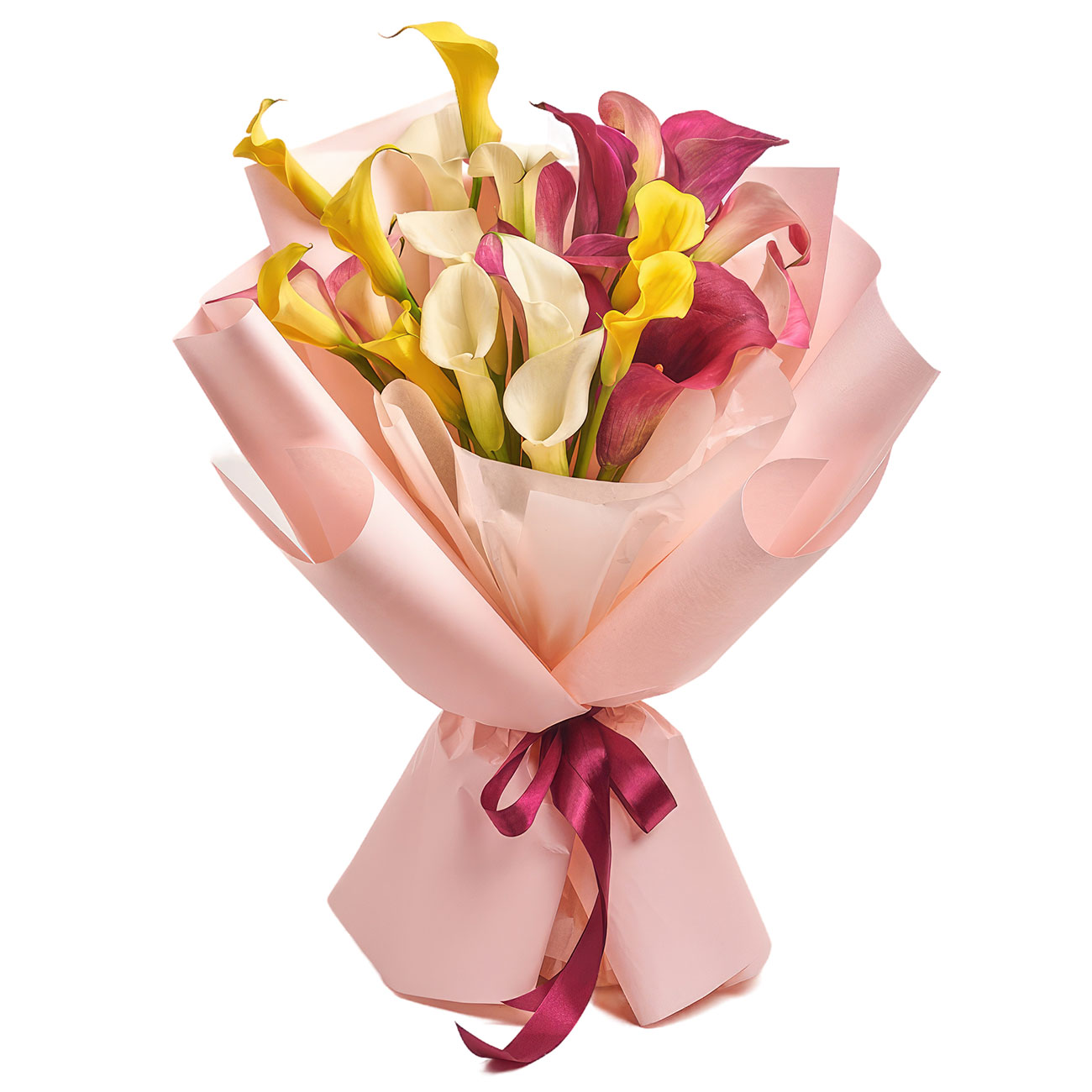 Каллы микс (желтые, белые, розовые). Упаковка (лента, пленка, крафт, сетка, пленка матовая)