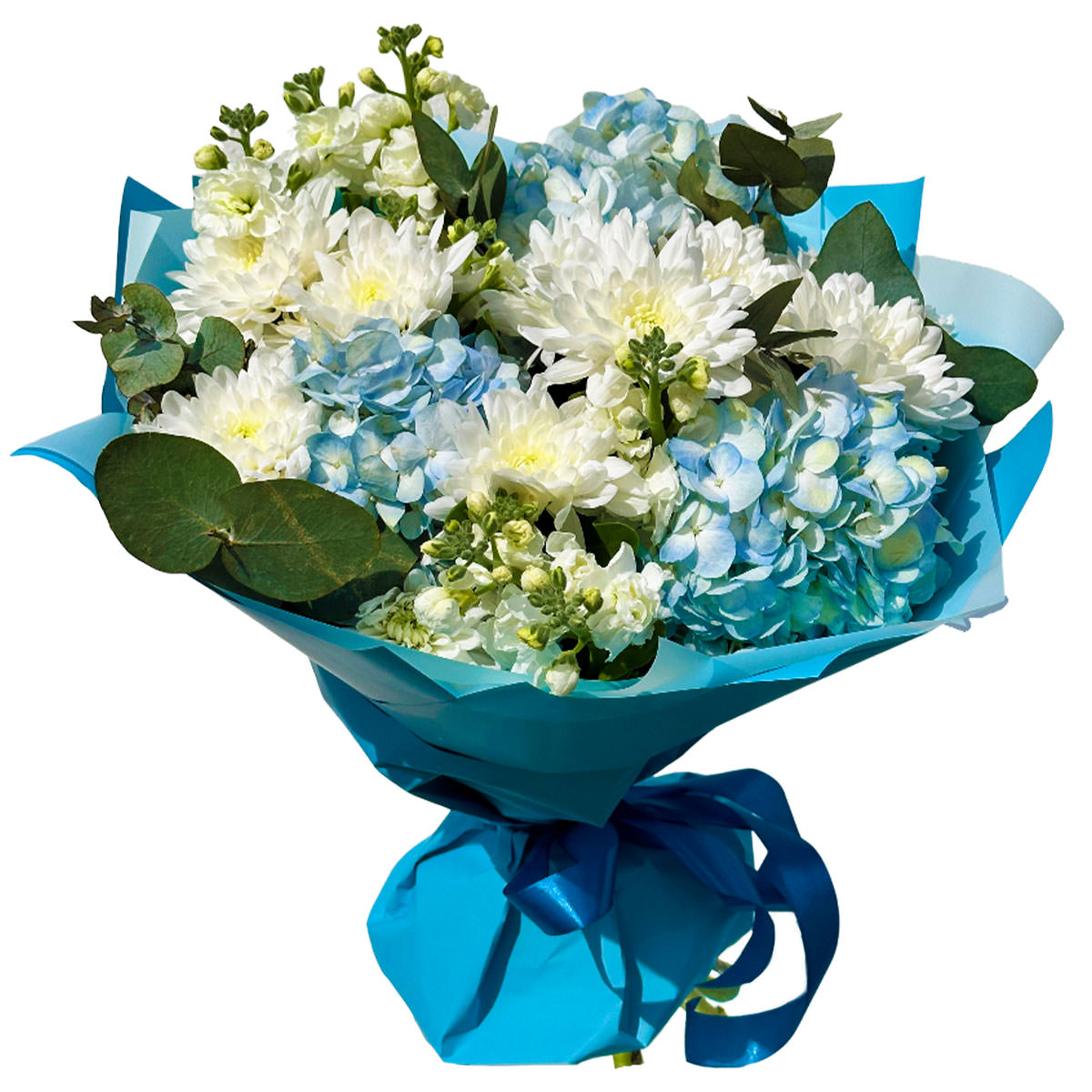 Гортензия голубая, хризантема белая, маттиола белая, эвкалипт. Упаковка (лента, пленка, крафт, сетка, пленка матовая)