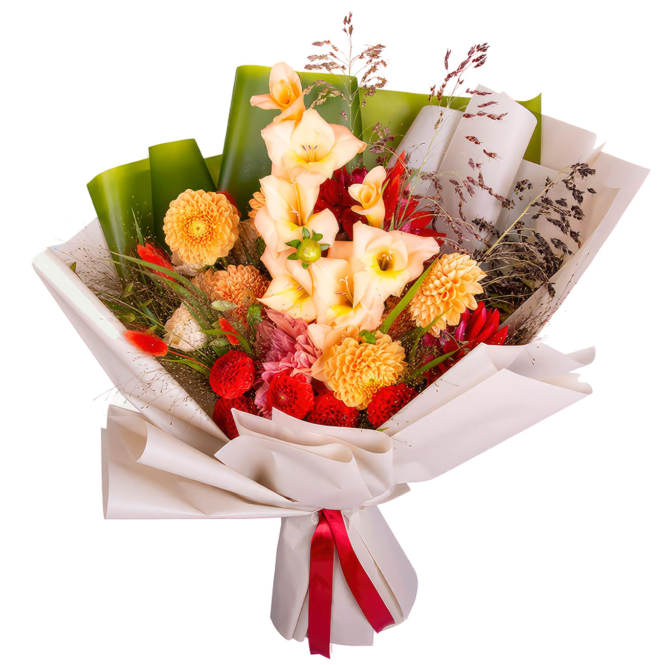 Георгина оранжевая и красная, гладиолус персиковый, лагурус, полевые цветы, сухоцветы. Упаковка (лента, пленка, крафт, сетка, пленка матовая)