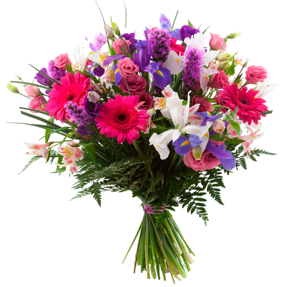 Гербера розовая, ирис белый и фиолетовый, эустома розовая, альстромерия белая, лиатрис, зелень. Упаковка (лента, пленка, крафт, сетка, пленка матовая)