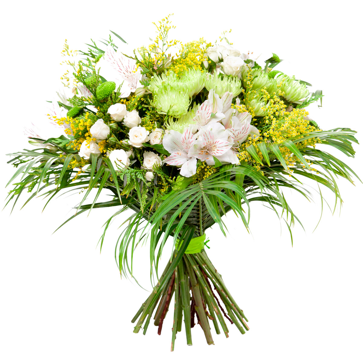 Альстромерия белая, хризантема игольчатая зеленая, хризантема кустовая зеленая, роза кустовая белая, робелини, солидаго. Упаковка (лента, пленка, крафт, сетка, пленка матовая)