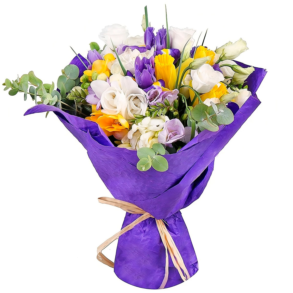 Ирис фиолетовый, эустома белая, нарцисс, эвкалипт. Упаковка (лента, пленка, крафт, сетка, пленка матовая)
