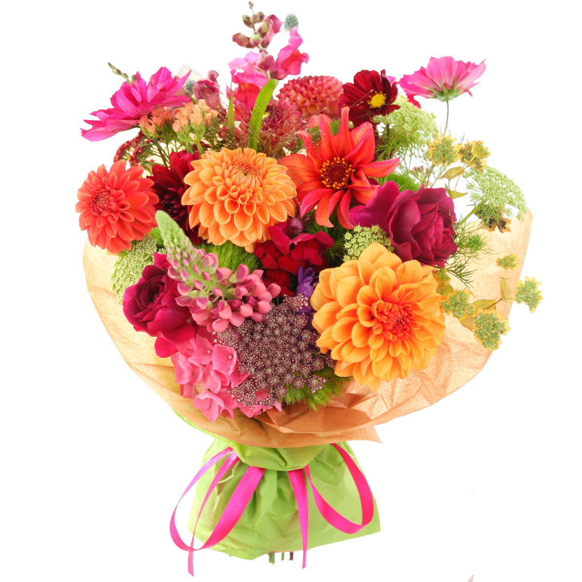 Георгина красная и оранжевая, люпин розовый, гортензия розовая, космея, статица персиковая, зелень. Упаковка (лента, пленка, крафт, сетка, пленка матовая)