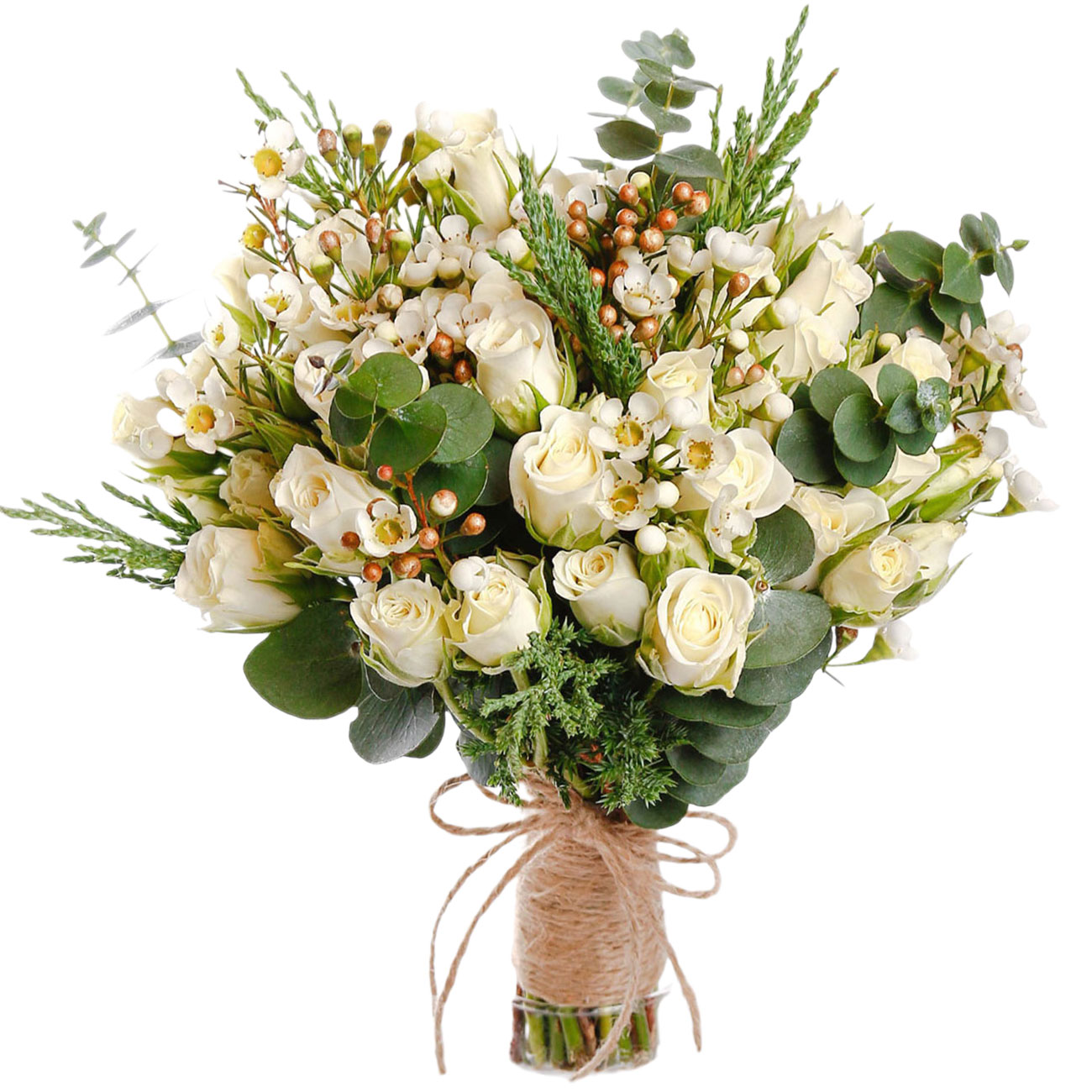 Ваксфлауэр, роза кустовая белая, эвкалипт, гиперикум, туя. Упаковка (лента, пленка, крафт, сетка, пленка матовая)