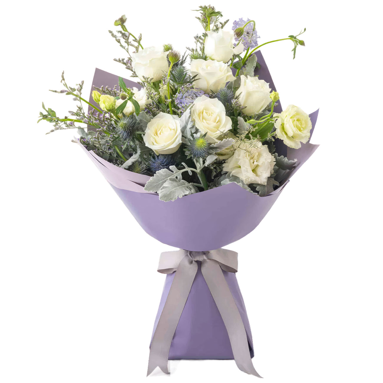 Роза белая кенийская, эрингиум, эустома белая, каспия, зелень. Упаковка (лента, пленка, крафт, сетка, пленка матовая)
