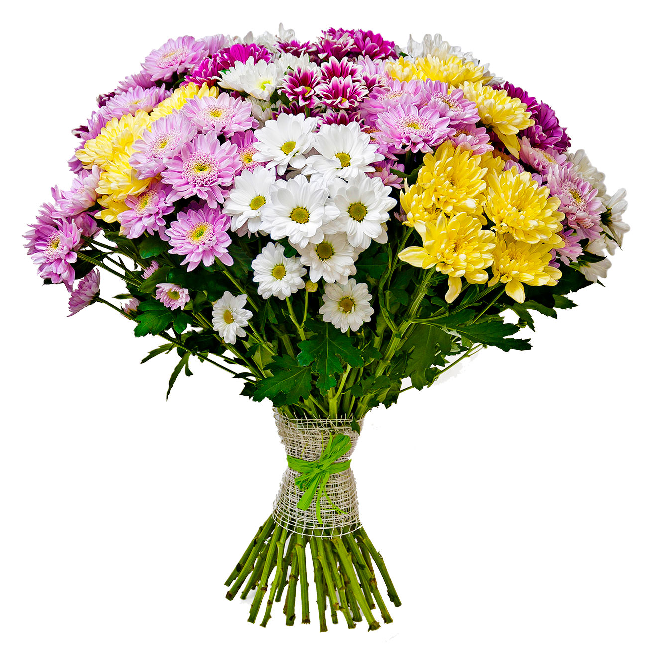 Хризантемы кустовые розовые, белые, желтые, фиолетовые.