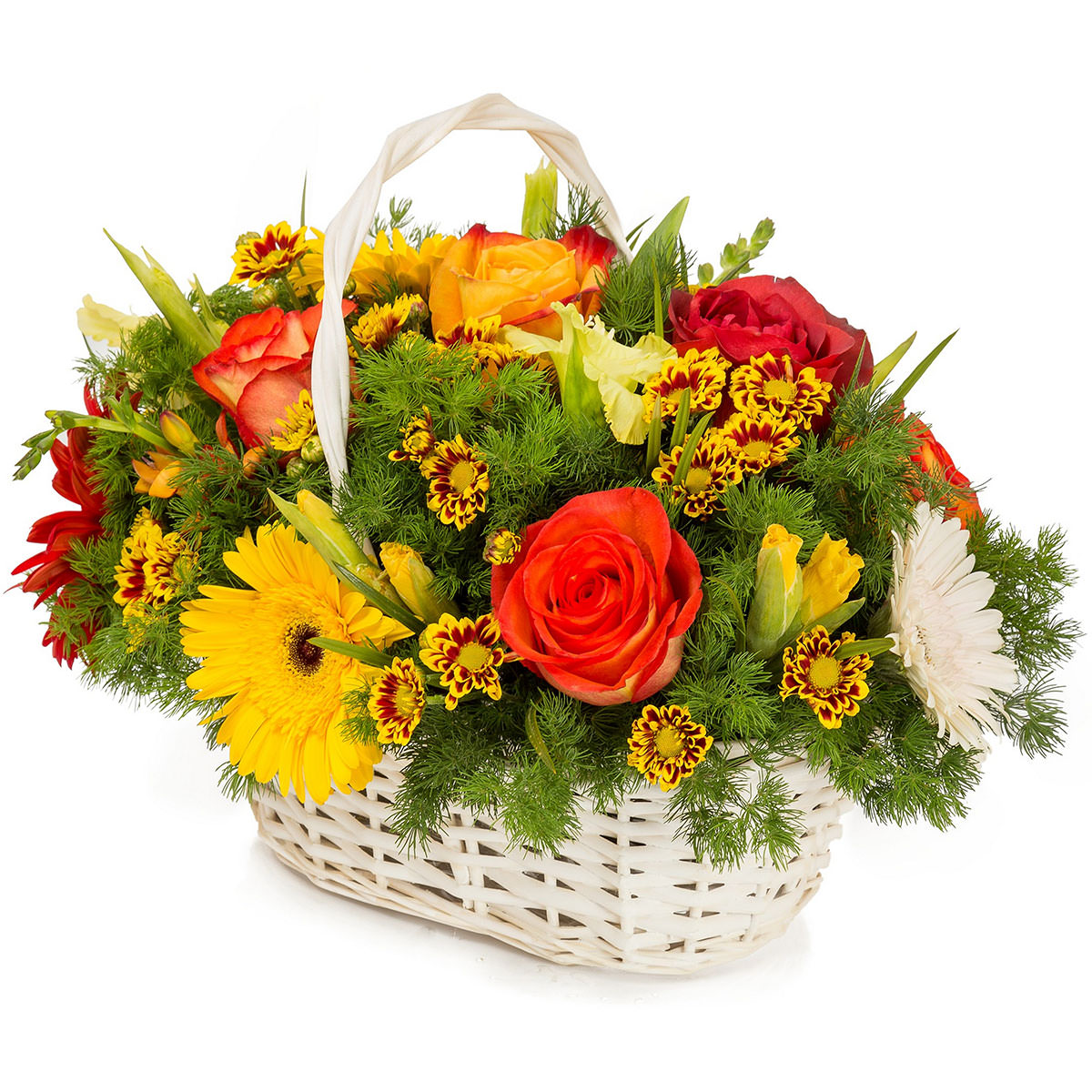 Роза одноголовая оранжевая, гербера желтая, красная и белая, хризантема кустовая желто-красная, гладиолус желтый, зелень. Упаковка (Корзина, оазис, ящик).