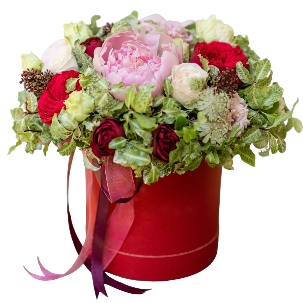 Пион розовый, роза пионовидная красная, роза кустовая белая, эустома светло-желтая, зелень. Упаковка (шляпная коробка, квадратный бокс, коробка сердце, оазис)