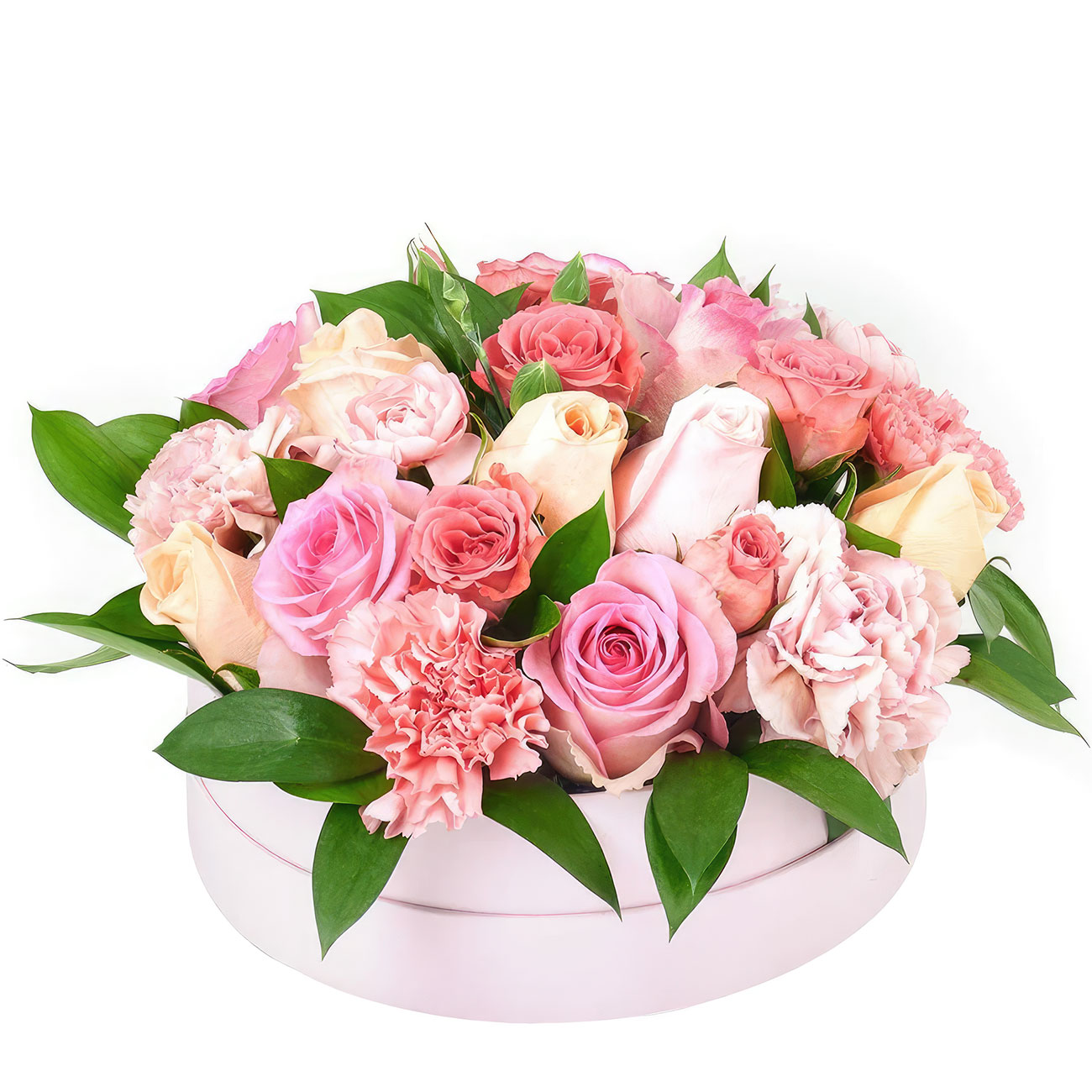 Роза одноголовая розовая и кремовая, диантус розовый. Упаковка (шляпная коробка, квадратный бокс, коробка сердце, оазис)