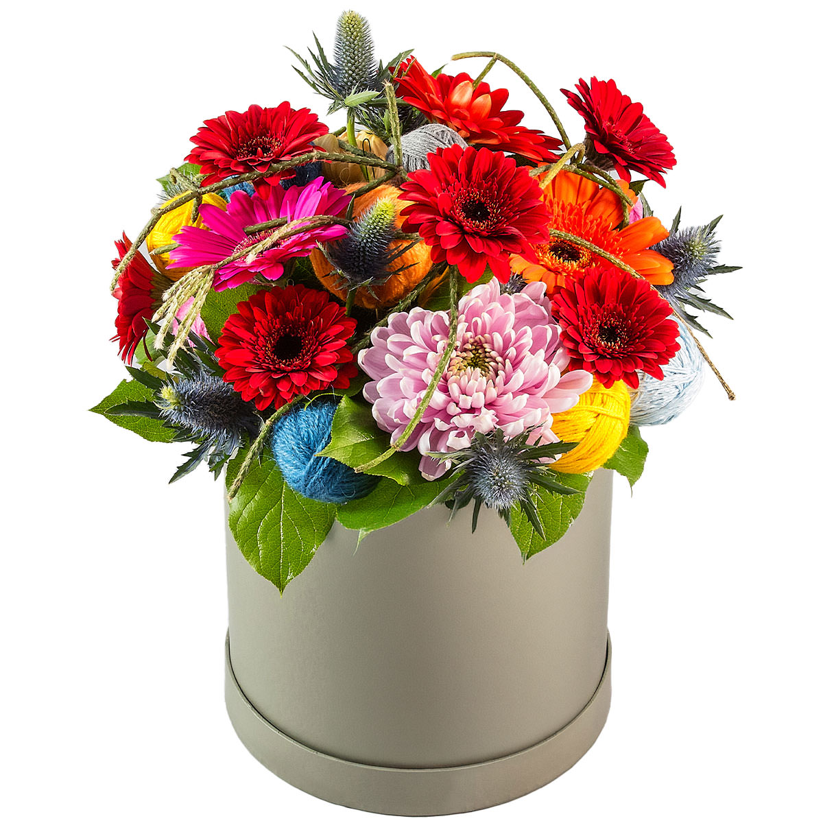 Гербера красная, оранжевая и розовая, георгина розовая, эрингиум, пряжа. Упаковка (шляпная коробка, квадратный бокс, коробка сердце, оазис)