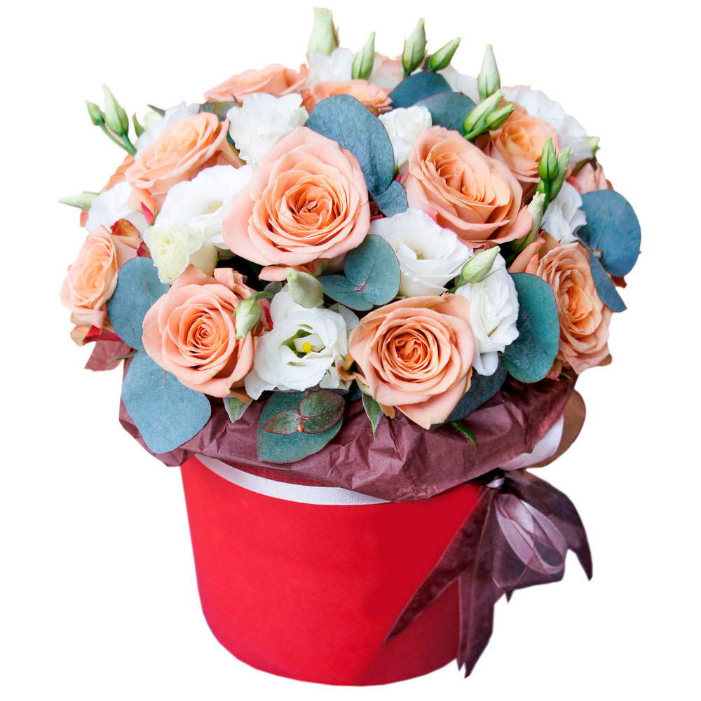 Роза одноголовая персиковая, эустома белая, эвкалипт. Упаковка (шляпная коробка, квадратный бокс, коробка сердце, оазис)
