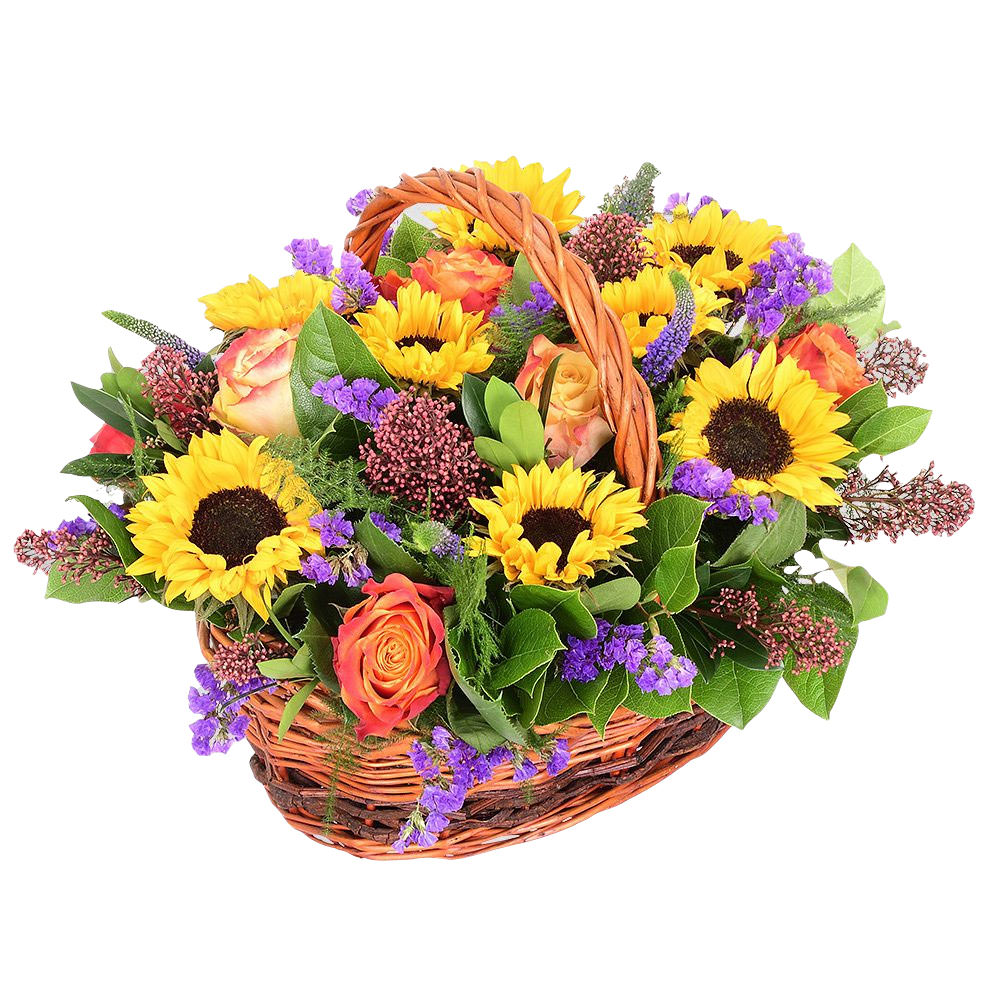 Роза одноголовая оранжевая, подсолнух, вероника, статица, скимия, зелень. Упаковка (Корзина, оазис).