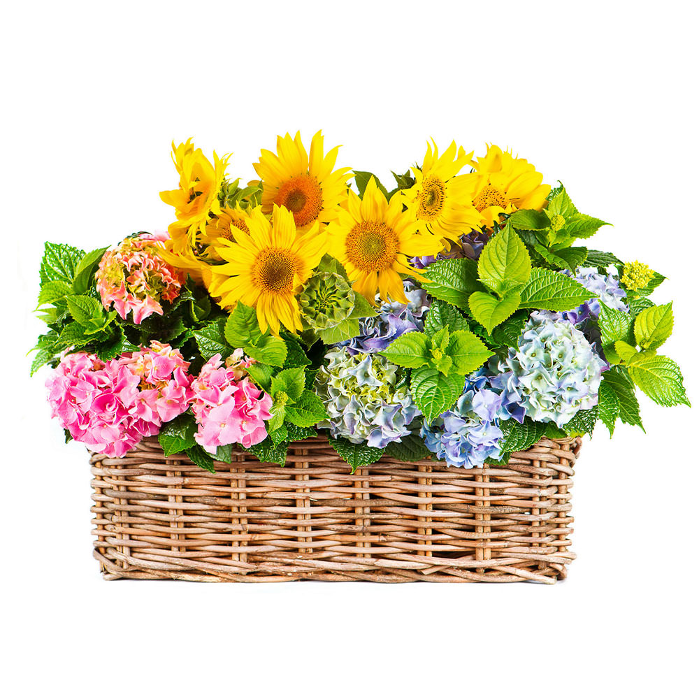 Подсолнух, гортензия голубая и розовая, мята. Упаковка (Корзина, оазис).